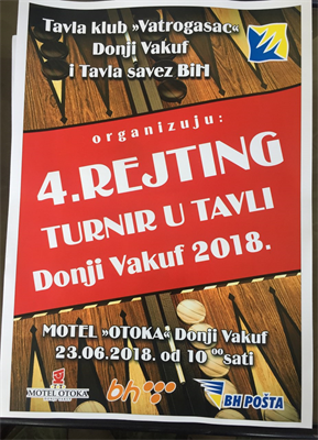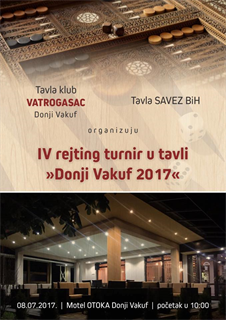 Obavještavaju se registrovani igrači u Tavla Savezu BiH da će se 4.rejting turnir u tavli održati 23.06.2018. u motelu Otoka u Donjem Vakufu sa početkom u 10 h. Kontakt brojevi : Manjušak Dževad 061 737 230 i Omeragić Abaz 061 798 135.