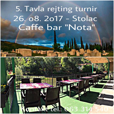 Obavještavaju se registrovani igrači u Tavla Savezu BiH da će se drugi rejting turnir održati 13.04.2019. sa početkom u 10 h u restoranu Megamarkt u Mostaru u organizaciji tavla kluba Stari Grad.
